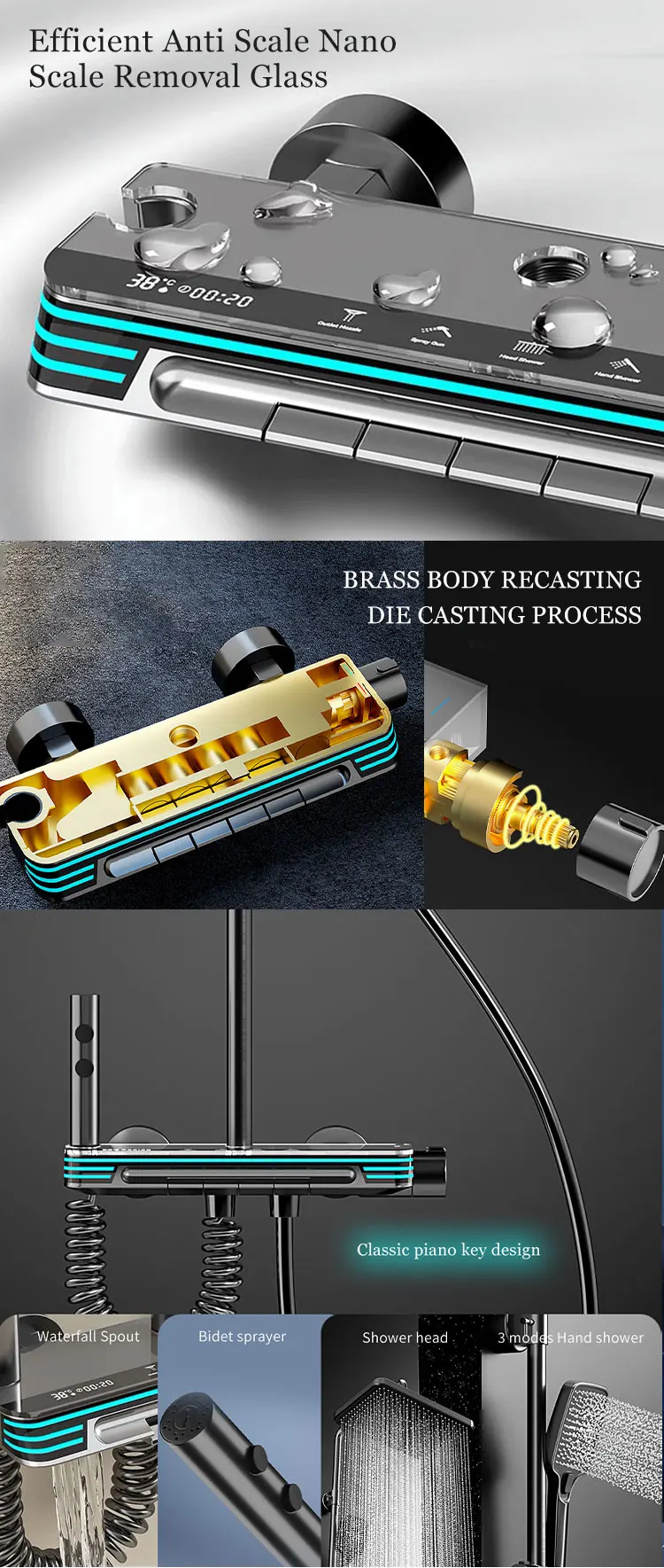 Multi-Functional Shower Experience: With a thermostatic faucet and multiple spray patterns (rain, jet, and massage), this shower system provides an unparalleled showering experience, allowing users to customize their water temperature and pressure to their liking.