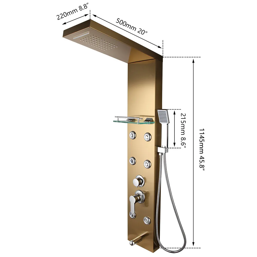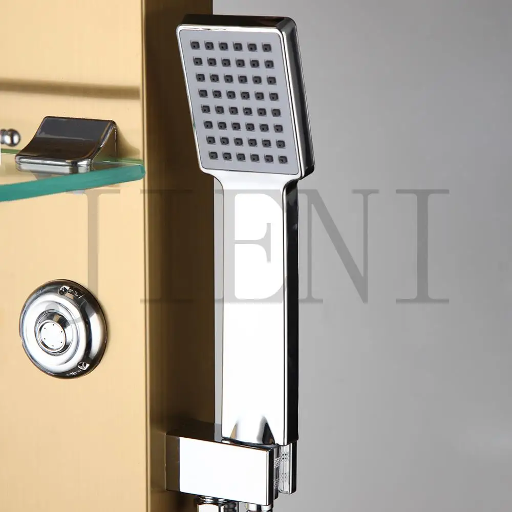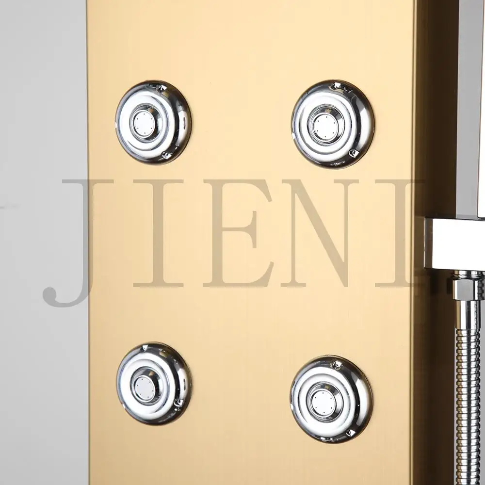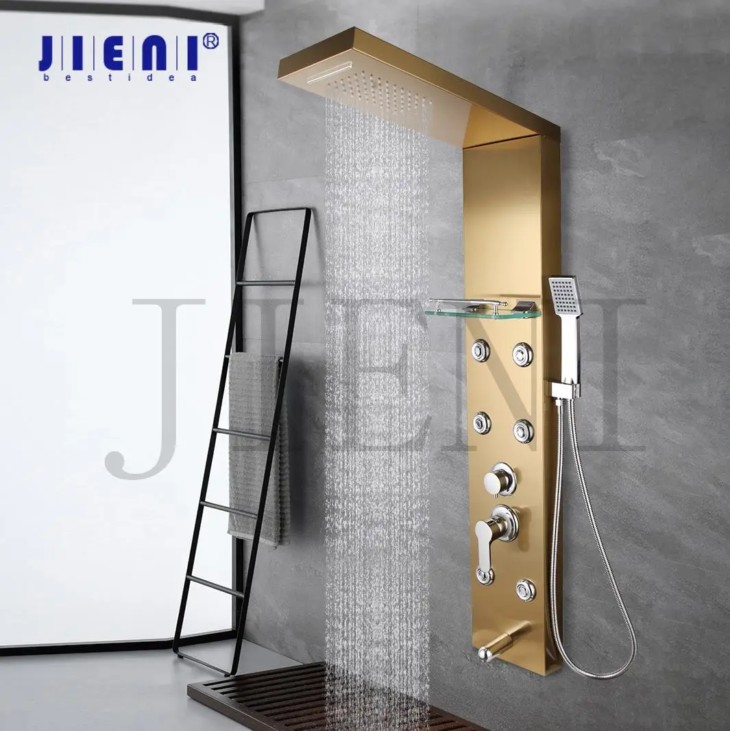 JIENI High-grade Bathroom Shower Column Golden Plated Wall Mounted w/ Shelf Hand shower Tub Spout Massage System Shower Panel